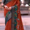 Rust Orange Silk with Teal Blue Zari Border & Bird Motif Design