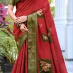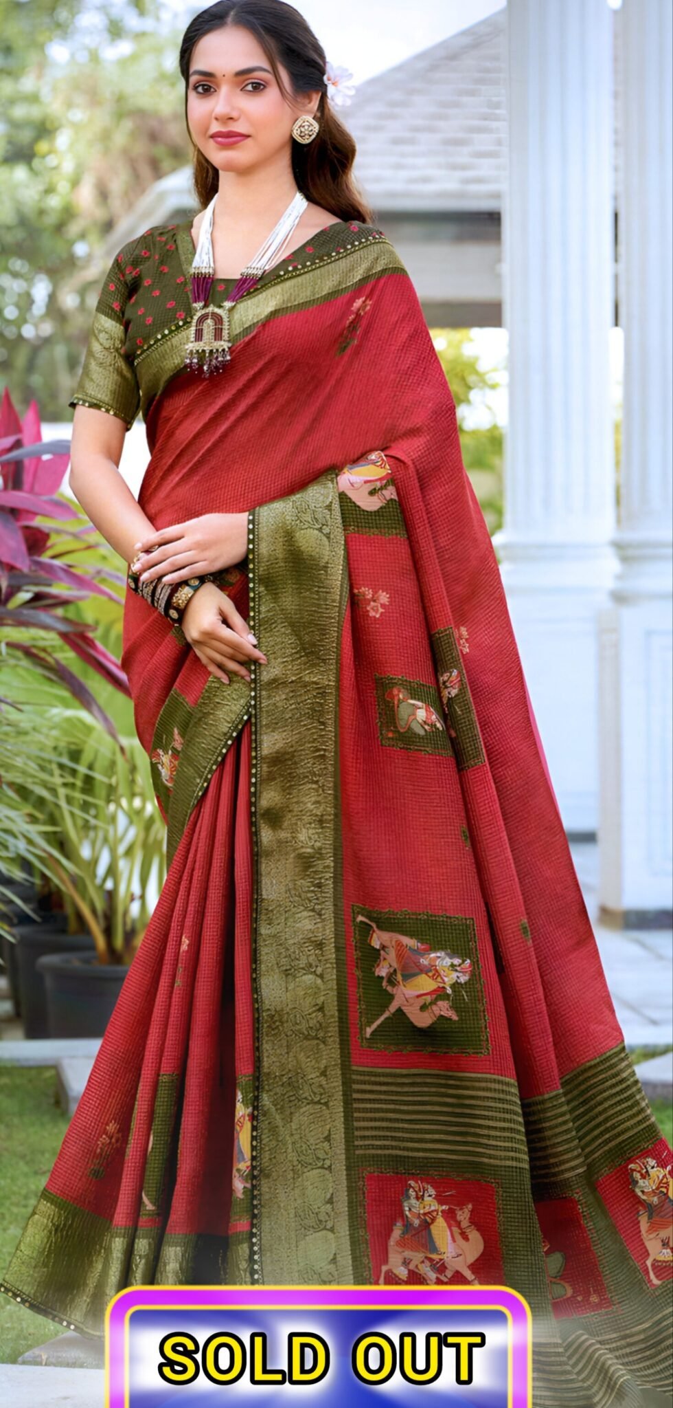 Crimson Red Silk with Olive Green Zari Border & Cultural Motifs