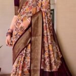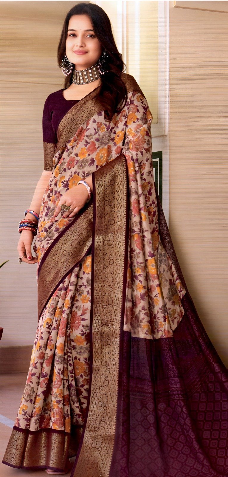 Elegant Beige Floral with Maroon Pallu & Zari Border.