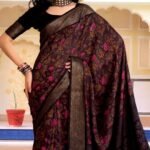 Elegant Dark Chocolate Brown with Floral Prints & Zari Border