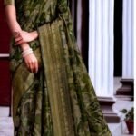 Elegant Olive Green Floral Silk Saree with Antique Zari Border