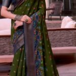 Elegant Olive Green Silk with Navy Blue Zari Border & Bird Motifs