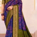 Elegant Royal Blue with Olive Green Zari Border & Floral Weaves