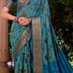 Elegant Royal Blue with Olive Green Zari Border & Floral Weaves