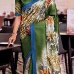 Olive Green Soft Silk with Floral Prints & Contrast Blue Border