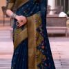 Royal Navy Blue Silk with Olive Green Zari Border & Traditional Motifs
