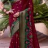 Rich Maroon Silk with Traditional Green Zari Border & Floral Motifs