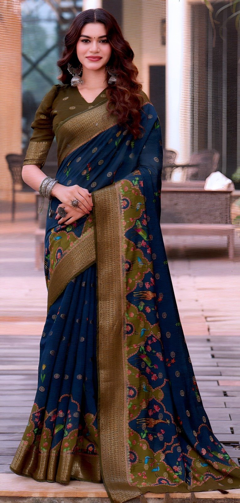 Olive Green Soft Silk with Floral Prints & Contrast Blue Border