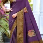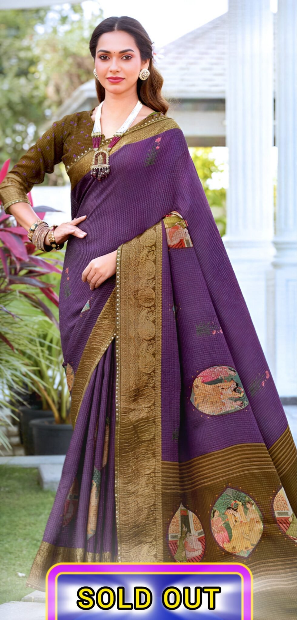 Royal Purple Silk with Antique Gold Zari Border & Cultural Motifs