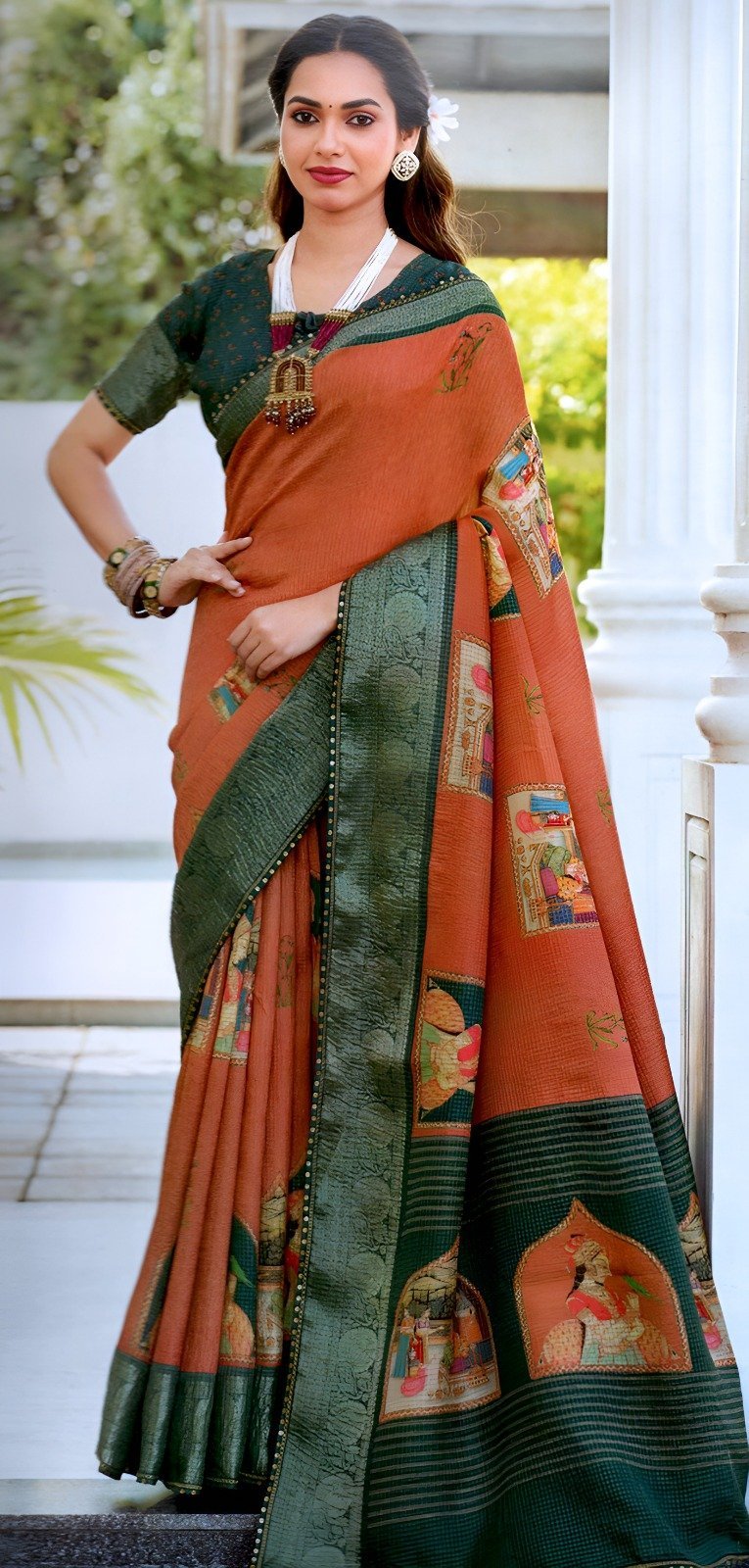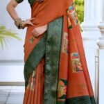 Rust Orange Silk with Deep Green Zari Border & Heritage Motif Pallu